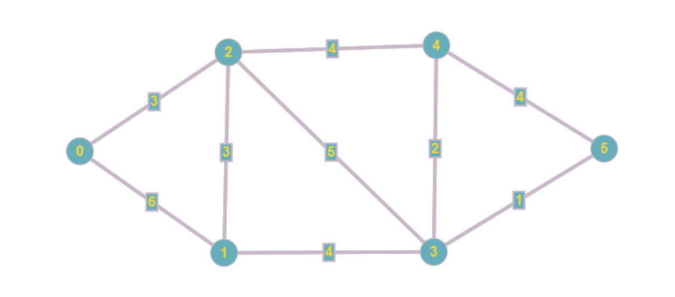 Shortest between nodes 0 and 5 is 9. The route is 0-2-3-5
